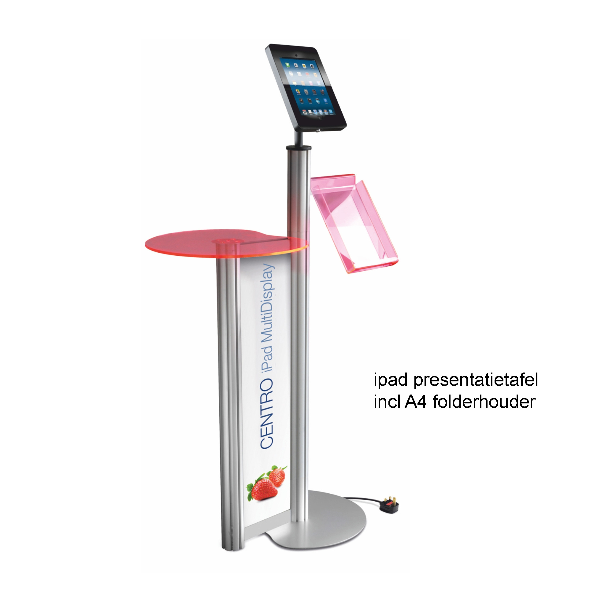 De presentatietafel is 1010mm en de iPad is 1265mm hoog. De folderhouder is A4 formaat.