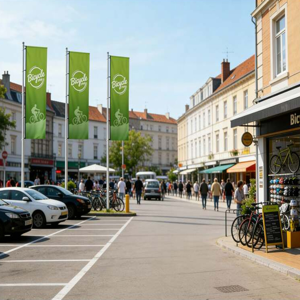 Een banier is een langwerpig, verticaal doek dat strak hangt (vaak met uithouder) en goed leesbaar is, ideaal voor vlaggenmasten en gevels.