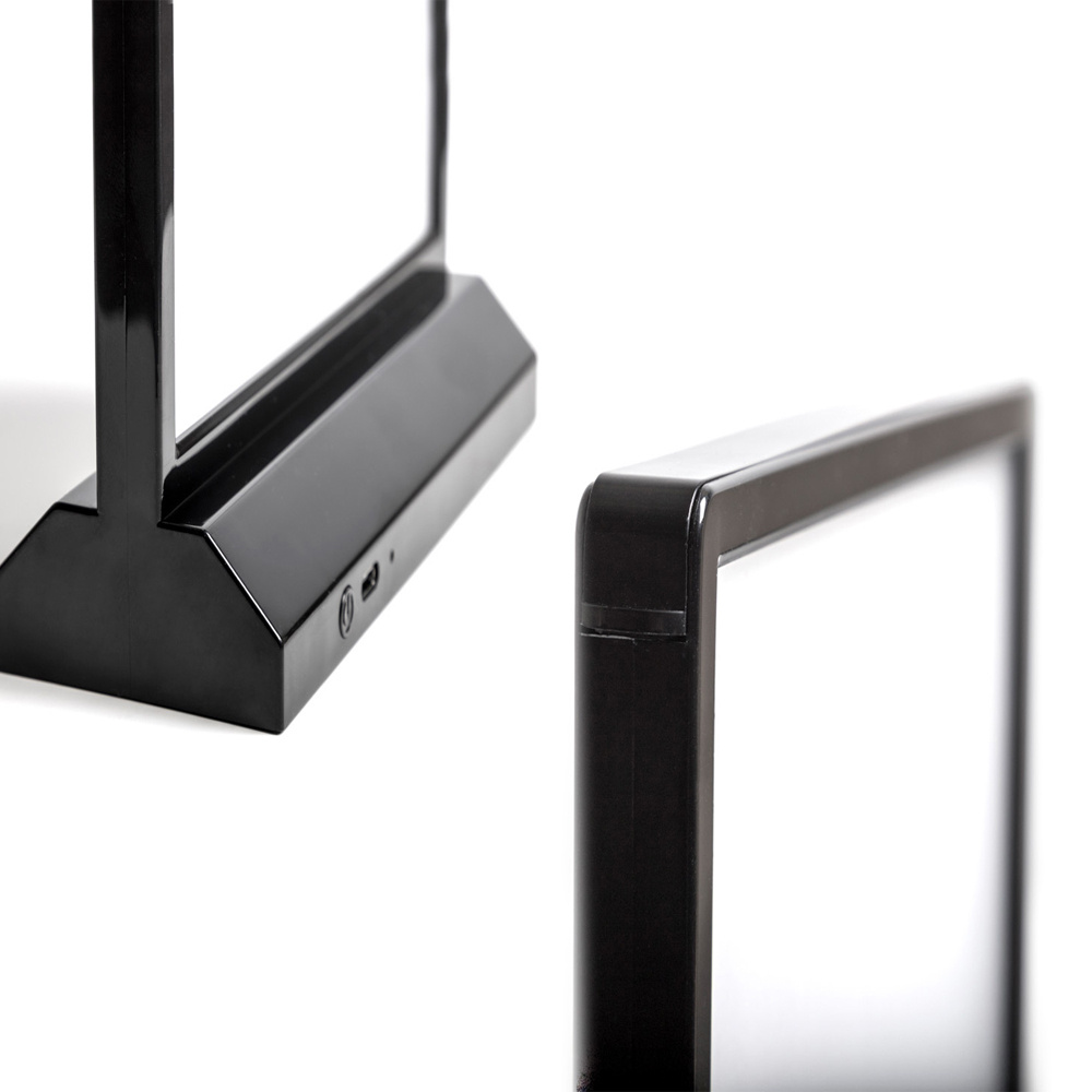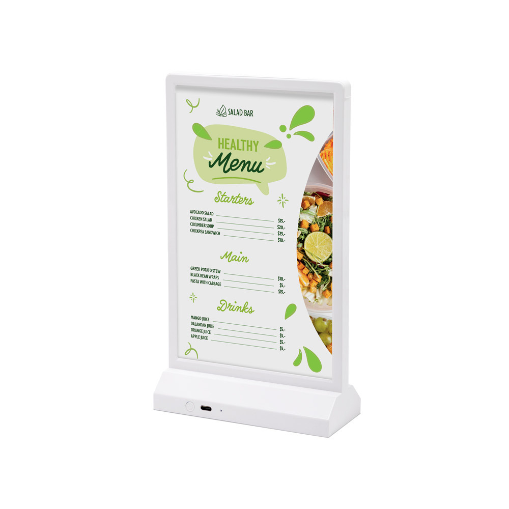 Lift jouw tafel- en baliepresentatie naar een hoger level met de verlichte T-standaard LED. Dankzij de hoogwaardige verlichting, het oplaadbare design en het eenvoudige posterwisselsysteem is deze standaard een krachtig display dat gegarandeerd de aandacht trekt. Jouw boodschap blijft levendig en zichtbaar dankzij de LED-verlichting. De T-standaard LED heeft een compact en strak ontwerp met een frame van slechts 12,5mm dikte. Het is een veelzijdige verlichte menukaarthouder voor elke promotionele setting en de perfecte oplossing voor tafels en balies. Of je nu aandacht wilt trekken in een bar, hotel, winkelbalie, evenement of beurs, de menukaarthouder LED-verlicht zorgt voor een helder en duidelijk uitgelichte reclame dat ongeveer 8 tot 10 uur meegaat op een volle lading, ideaal voor evenementen en lange presentaties.